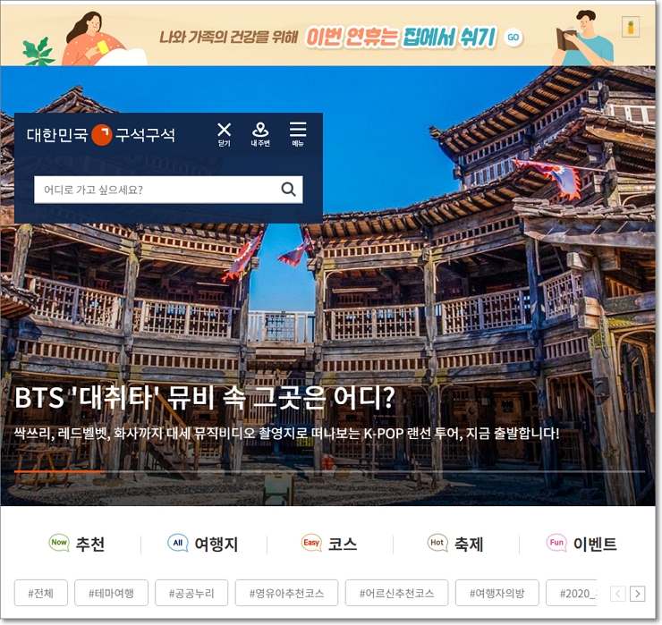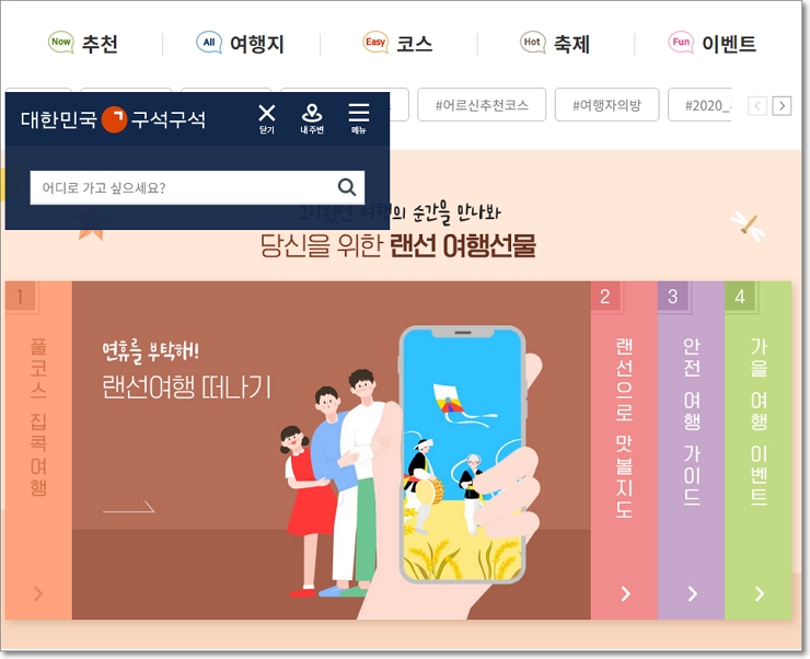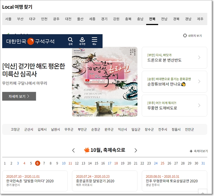 이러한 부분을 대부분 충족시킬 수 있는 곳이 있습니다. 한국관광공사에서 운영하는 대한민국 구석구석 사이트에서 랜선을 통한 사전답사도 할 수 있고, 현지 정보와 유명 관광지, 축제 행사 등 대부분의 정보를 얻을 수 있습니다.